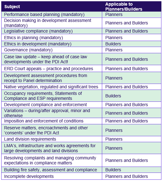 Our “standard” CPD topics and their relevance to Accredited professional-planning and Accredited professional-building CPD requirements are below: